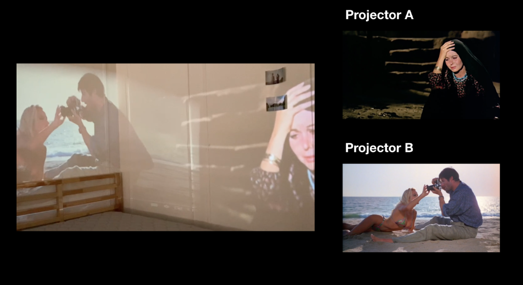 In addition to being inspired by Shirin Neshat's work, the idea of projection came from my childhood, where villagers would often come together in a town square and watch old Turkish movies outside, on a projector. In future iterations I would continue to explore overlapping projections and work on creating an immersive, chaotic soundscape to accompany the image. I would also redo the current setup with two projectors of the same brand or specifications, as this will allow the images to blend better.